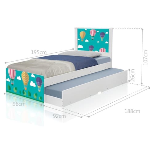 A Bicama Bibox Juvenil Barcelona Adesivada Balões no Céu é belíssima e conta com um design funcional, que ocupa pouco espaço no ambiente.