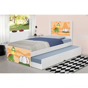 A Bicama Juvenil Barcelona Adesivada Dinossauro Baby é belíssima e conta com um design funcional, que ocupa pouco espaço no ambiente. A Coleção Dinossauro Baby foi desenvolvida por nossos designers oferecendo um visual exclusivo, descontraído e divertido ao ambiente. A cama auxiliar fica embaixo da principal e basta puxá-la por meio das corrediças para começar a fazer dela. É ideal para quartos pequenos e para caso precise de uma cama extra para receber um amigo, ou divida o dormitório com alguém. Feita em MDF e MDP e seu acabamento é feito com pintura UV brilhante tornando-a um produto resistente e com aspecto de novo por muito mais tempo. É uma excelente escolha para acomodar colchões de solteiro na medida de 188 cm x 88 cm de largura.