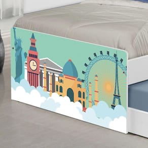 A Bicama Juvenil Barcelona Adesivada Mundo Viagens é belíssima e conta com um design funcional, que ocupa pouco espaço no ambiente. A Coleção Mundo Viagens foi desenvolvida por nossos designers oferecendo um visual exclusivo, descontraído e divertido ao ambiente. A cama auxiliar fica embaixo da principal e basta puxá-la por meio das corrediças para começar a fazer dela. É ideal para quartos pequenos e para caso precise de uma cama extra para receber um amigo, ou divida o dormitório com alguém. Feita em MDF e MDP e seu acabamento é feito com pintura UV brilhante tornando-a um produto resistente e com aspecto de novo por muito mais tempo. É uma excelente escolha para acomodar colchões de solteiro na medida de 188 cm x 88 cm de largura.