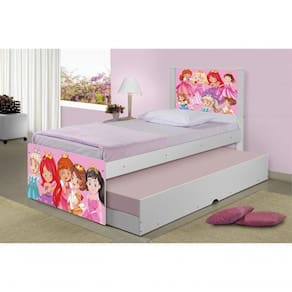 A Bicama Juvenil Barcelona Adesivada Princesinhas é belíssima e conta com um design funcional, que ocupa pouco espaço no ambiente. A Coleção Princesinhas foi desenvolvida por nossos designers oferecendo um visual exclusivo, descontraído e divertido ao ambiente. A cama auxiliar fica embaixo da principal e basta puxá-la por meio das corrediças para começar a fazer dela. É ideal para quartos pequenos e para caso precise de uma cama extra para receber um amigo, ou divida o dormitório com alguém. Feita em MDF e MDP e seu acabamento é feito com pintura UV brilhante tornando-a um produto resistente e com aspecto de novo por muito mais tempo. É uma excelente escolha para acomodar colchões de solteiro na medida de 188 cm x 88 cm de largura.