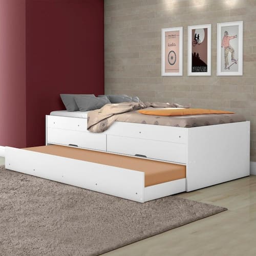 Bicama Juvenil Bari Branco Branco. Produto em MDF/MDP Pintura semi brilho Utilizar pano seco para limpeza. . Possui 2 gavetas, peso suportado, 5 kg cada. Cama auxiliar utilizar colchão com altura máxima de 14 cm peso suportado 100kg Ean: 7909903332115