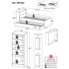 Especificações Técnicas: Bicama - Altura: 80,5cm | Largura: 215,5cm | Profundidade: 88 (fechada) - 171cm (aberta) Sapateira - Altura: 147 cm | Largura: 55 cm | Profundidade: 37,5 cm Material: MDP (12 e 15mm) Tipo de Cama: Bicama Peso Suportado da Cama Principal: 100kg Peso Suportado da Cama Auxiliar: 70kg Inclui Rodízios: Sim Sapateira Inclusa no Kit: Sim Colchões Inclusos: Não (tamanho indicado: 188x78cm)