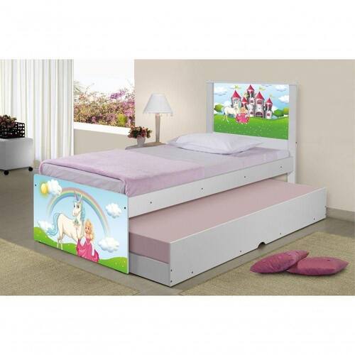 A Bicama Juvenil Barcelona Adesivada Princesa Encantada é belíssima e conta com um design funcional, que ocupa pouco espaço no ambiente. A Coleção Princesa Encantada foi desenvolvida por nossos designers oferecendo um visual exclusivo, descontraído e divertido ao ambiente. A cama auxiliar fica embaixo da principal e basta puxá-la por meio das corrediças para começar a fazer dela. É ideal para quartos pequenos e para caso precise de uma cama extra para receber um amigo, ou divida o dormitório com alguém. Feita em MDF e MDP e seu acabamento é feito com pintura UV brilhante tornando-a um produto resistente e com aspecto de novo por muito mais tempo. É uma excelente escolha para acomodar colchões de solteiro na medida de 188 cm x 88 cm de largura.
