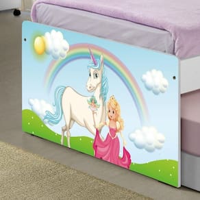 A Bicama Juvenil Barcelona Adesivada Princesa Encantada é belíssima e conta com um design funcional, que ocupa pouco espaço no ambiente. A Coleção Princesa Encantada foi desenvolvida por nossos designers oferecendo um visual exclusivo, descontraído e divertido ao ambiente. A cama auxiliar fica embaixo da principal e basta puxá-la por meio das corrediças para começar a fazer dela. É ideal para quartos pequenos e para caso precise de uma cama extra para receber um amigo, ou divida o dormitório com alguém. Feita em MDF e MDP e seu acabamento é feito com pintura UV brilhante tornando-a um produto resistente e com aspecto de novo por muito mais tempo. É uma excelente escolha para acomodar colchões de solteiro na medida de 188 cm x 88 cm de largura.