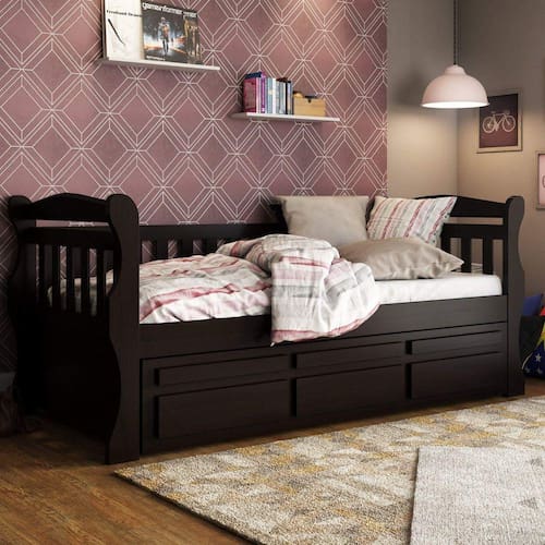 A Bicama de Solteiro da Espresso Móveis é produzido em madeira maciça de Pinus. Possui Cama auxiliar com sistema de rodízio fixo, gavetas todas com corrediças em madeira central com deslizante em plastico, estrados em madeira de pinus largura 20mm. Acabamento da Gaveta: Pintura Acompanha Cama Auxiliar: Sim Acompanha Colchão: Não Acompanha Dossel: Não Acompanha Móbile: Não Acompanha Suporte para Mosquiteiro: Não Altura do Estrado até o Chão: 47 cm Ambiente: Quarto Cama Auxiliar Acompanha Colchão: Não Cama Auxiliar com Rodízio: Sim Cama Auxiliar Suporta Até (kg): 120 kg Complexidade da Montagem: Baixa: pode ser montado por uma pessoa sozinha Cor: Marrom Cor: Marrom Escala de Brilho: Fosco Escala de Brilho da Gaveta: Fosco Extensível: Não Gaveta com Chave: Não Itens Inclusos: 1 Bicama e Manual de Montagem. Manual de Montagem e Instalação: https://cdn2.madeiramadeira.com.br/atributo/moveis-saraiva/516243-it-bicama-luiza.pdf Material da Gaveta: Madeira Maciça Material do Estrado: Pinus Material Principal: Madeira Maciça Necessita Montagem: Sim Origem do Produto: Nacional Permite a Utilização de Cama Auxiliar: Sim Peso: 63 kg Peso Máximo por Gaveta: 5 kg Possui Baú: Não Possui Gavetas: 03 Possui Pés: Não Possui Portas: Não Possui Prateleiras: Não Possui Rodízio: Sim Recomendações de Uso, Manutenção e Limpeza: Limpeza com pano umedecido, não aplicar lustra móveis. Resistente à Chuva: Não Rodízio com Trava: Não Sapatas Niveladoras: Não Sistema de Montagem: Kit Ferragens : Cavilhas, Roldanas e Parafusos. Tamanho do Colchão Indicado (L x C): 88cm x 188cm - Cama auxiliar altura de no máximo 14cm Tamanho do Colchão Indicado Cama Auxiliar: 14cm x 88cm x 188c Tipo de Cama: Bicama Tipo de Colchão: Solteiro Tipo de Corrediça da Gaveta: Madeira Tipo de Estrado: Removível Tipo de Madeira Maciça: Pinus Tipo de Madeira Maciça da Gaveta: Eucalipto Tipo de Puxador da Gaveta: Embutido