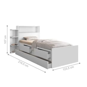 Bicama Solteiro Com Baú E Nicho Branco Cama Solteiro Com Baú e Auxiliar BrancoA Cama Baú , possui um belo designe dando o toque final ao ambiente e oferece conforto.Foi feita pensando em aproveitar o máximo de seu ambiente,graças as suas duas gaveta,quatro estantes e seu baú deixando seu quarto organizado.Possui acabamento em pintura UV.Informações do Produto:Altura: 107 cmLargura: 123,5 cmComprimento: 216,5 cmInformações Adicionais:Ideal para Colchões: 88cm x 188cm com selo INMETRO (Colchão Não Incluso).Matéria Principal: MDF, MDP e MadeiraGarantia: 3 meses contra defeito de fabricação.Cor predominante: BrancoPrateleiras: 4.Escala de Brilho: Brilhante.Itens Inclusos:01 Cama solteiro com Auxiliar.Kit completo para montagem e manual detalhado de instruções.Informações complementares:- Fotos meramente ilustrativas do produto no ambiente.- Os objetos que ambientam as fotos não acompanham o produto;- Verificar descrição e tamanho do produto antes da compra.- Avaliar a mercadoria no ato do recebimento e recusar em caso de divergência ou .- Mantenha as informações de contato e endereço de atualizados para entrarmos em contato caso necessário.- Limpar com flanela ou pano macio seco, não utilizar produtos abrasivos, desengordurantes, álcool ou solvente. Não expor o produto diretamente à luz solar e à umidade.* Sugerimos a contratação de um montador para a montagem do produto. Não nos responsabilizamos por causadas no ato da montagem.* Não nos responsabilizamos pela montagem e desmontagem do produto no ato da e , assim como os custos gerados nestas situações.* A transportadora rá o produto no andar térreo do endereço de .* Não nos responsabilizamos por subir escadas, corredores e elevadores ou transporte por guincho em apartamentos.