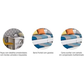 Material de Estrutura - MDF Tipo de Pintura - Ultravioleta Tipo de Acabamento da Pintura - Semi Brilho Tipo de Acabamento - Móvel c/ Bordas Arredondadas Tamanho da Cama - Solteiro Tamanho do Colchão Indicado - Solteiro 88x188 Diferenciais das Camas - c/ Gavetas Suporte de Peso - 80 kg