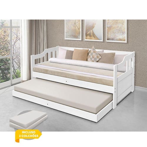 Esse belíssimo Sofá Cama possui um design minimalista e atrativo o que permite que o mesmo seja alocado em ambientes variados como salas de estar ou quartos e ele também uma estrutura em madeira de reflorestada, altamente resistente e durável. Ideal para acomodar Colchão Solteiro (088).CaracterísticasDimensões do Sofá Cama:Aberto: Comprimento 195cm - Profundidade 190cm - Altura 80cmFechado: Comprimento 195cm - Profundidade 96cm - Altura 80cmCor: BrancoItens Inclusos:1 Sofá cama2 ColchõesColchão indicado: Comprimento 188cm - Profundidade 88cm - Altura 12cmDescrição TécnicaMadeira maciçaEstrutura do material:Barras com 25mm e braços laterais com 20mmEspessura da cama auxiliar 22mmAcabamento em Verniz PU Semi BrilhoPeso suportado por pessoa:Sofá Cama 200kgCama auxiliar 120kg4 Pés em madeiraEspessura dos pés 90mmx25mmRipas em Compensado Naval 70mm x 10mmSarrafos em Eucalipto com espessura de 22mm x 45mmComplexidade da montagem: Média, pode ser montado por apenas uma pessoa e/ou necessite de maior conhecimento para montagem.Recomendações de uso, manutenção e limpeza: Limpar com flanela ou pano macio seco, não utilizar produtos abrasivos, desengordurantes, álcool ou solvente. Não expor o produto diretamente a luz solar e à umidade.ATENÇÃOAS IMAGENS SÃO MERAMENTE ILUSTRATIVAS E PODEM SOFRER VARIAÇÕES DE COR E PEQUENOS DETALHES DE ACORDO COM O SEU MONITOR, ILUMINAÇÃO DO AMBIENTE E ATÉ MESMO A SUA PERCEPÇÃO VISUAL.Bicama Solteiro Madeira MaciÃa Vintage + 2 Kit Atraente MÃveis - Branco