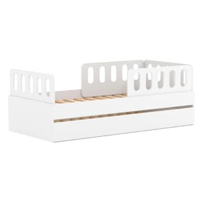 Diferenciais: Auxiliar com 4 rodízios, MDF Melamina 15mm, Estrados em Madeira Maciça, 02 Grades e Cabeceira e Peseira Anatômica.