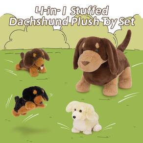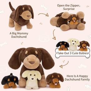 Bicho de pelúcia para cães Dachshund com 3 bebês - Pelúcia de cachorro Dachshund de pelúcia 4 em 1: o dachshund da mamãe grande vem com 3 bebês adoráveis. Abra o zíper, você encontrará a surpresa. Deixe as crianças brincarem com a família de cães dachshund. - Design realista: nossos brinquedos de dachshund de pelúcia são realistas em termos de cor, estatura corporal e rosto. Ele cativa a imaginação do seu filho, proporcionando horas de brincadeiras interativas em ambientes internos e externos, despertando a paixão do seu filho por explorar o mundo do dachshund. - Tamanho adequado: o bicho de pelúcia grande mede 45 cm, macio e aconchegante, ótimo tamanho para abraços. E os lindos bebês dachshund são adequados para mãos pequenas. É uma companhia perfeita para as crianças na hora de dormir, relaxar, brincar e estudar. - Multifuncional: o cão salsicha de pelúcia pode ser utilizado como um brinquedo educativo crescendo com seu filho. Como é muito macio, pode ser seu travesseiro quando você se sentir cansado. Também é uma escolha maravilhosa para decorar a festa ou sala com tema animal do seu filho, proporcionando mais diversão para a festa. - Presente adorável: o brinquedo de dachshund macio é um presente adorável para os amantes de cães em qualquer ocasião, como Dia dos Namorados, aniversário, dia de Natal, Halloween, Dia de Ação de Graças, chá de bebê, Páscoa. É uma escolha fantástica para espalhar felicidade e criar memórias queridas.
