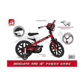 Pneus de borracha com câmara, Freio V-BrakeMovimento de direção e central com esferasGuidão com limitador de giro e regulagem de altura para melhor ergonomiaManoplas em TPE atóxicoCarenagem removívelRodinhas laterais removíveis fixadas no quadro, que ajudam na conquista do equilíbrio e auxiliam na aprendizagemSelim anatômico acolchoado com regulagem de alturaCobre corrente integral
