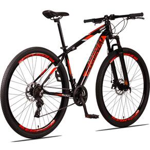 A bike vem equipada com 24 combinações de marcha, sendo uma coroa tripla na frente e catraca de 8 coroas atrás. Seu sistema de transmissão é indexado possibilitando trocas de marchas de forma rápida e segura. Para as frenagens são utilizados freios a disco que proporcionam maior segurança. A suspensão dianteira amortece os impactos tornando o passeio mais confortável!