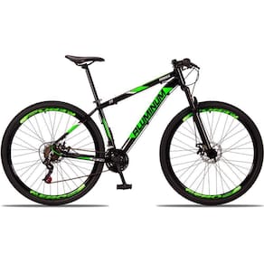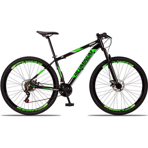 Aro: 29 | Marchas: 21 | Modalidade: Passeio | Suspensão: Dianteira | Material do Quadro: Quadro ALUMINUM Raider Aro 29 em ALUMÍNIO 6061 | Modelo e Composição do Garfo: Garfo / Suspensão Aro 29 PRETO 100MM | Marca e Modelo do Sistema de Câmbio: Câmbio Dianteiro Importado 3v / Câmbio Traseiro Importado 7v / Trocador de Marchas Revoshift - Giratório - 21v | Marca e Composição do Pedivela: Pedivela Reduzido em Aço | Modelo e Composição do Freio: Freio a Disco 160mm Preto - MECÂNICO | Material da Roda: Aros Aero 36 Furos Folha Dupla Alumínio | Pneus: Pneu 29 (Imp.) | Marca e Composição dos Cubos: Cubos em Aço p/ Disco 36f Preto com Blocagens | Modelo e Composição do Guidão: Guidão Mega Over Reto Expandido em Alumínio | Marca e Composição do Selim: Selim Sport com carrinho | Material do Canote: Alumínio sem carrinho | Importante: Bicicleta para passeios e trilhas leves, não indicada para manobras radicais e trilhas pesadas / Consulte o tamanho de quadro adequado à sua altura antes de realizar a compra. | Montagem do Equipamento: A montagem é de responsabilidade do cliente, sugerimos que seja efetuada por uma oficina especializada. | Garantia do Fabricante: 90 dias. A garantia será validada para as bicicletas montadas e revisadas por uma oficina especializada e é referente apenas ao primeiro proprietário | Informação Relevante: Pode haver alguma diferença de tonalidade entre a imagem e o produto real, por conta do tratamento de imagens e a calibração de cores do monitor Cor: Preto+verde