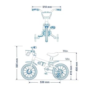 Idade recomendada: A partir de 3 Anos Pneu em EVA resistente Aro 12 Quadro, garfo e guidão em aço carbono Limitador de giro do guidão Cestinha e Garrafinha Mesa de direção em nylon reforçado Selim com regulagem de altura Freio traseiro a tambor Trava de segurança Rodinha laterais