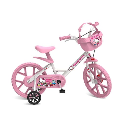 A Bicicleta Aro 14 Hello Kitty é indicada para crianças a partir de 4 anos, com altura entre 90 e 125 cm e peso máximo de 27 kg. As rodinhas laterais são ideais para os primeiros contatos com a bicicleta, podendo ser removidas quando a criança ganhar confiança e equilíbrio.
