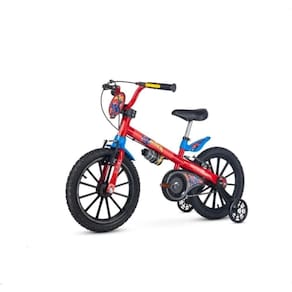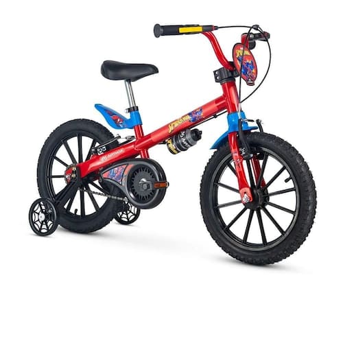 Bicicleta Aro 16 Homem-Aranha - Nathor As bicicletas aro 16 Nathor possuí modelos com aro em ABS e em alumínio. O limitador de giro evita que o guidão vire completamente, proporcionando mais segurança e preservando o freio. Para facilitar o aprendizado e a identificação do freio traseiro, a maçaneta amarela ganha destaque e indica o acionamento ideal na hora da frenagem. As rodinhas laterais permitem o desenvolvimento da criança na fase de aprendizado, estimulando o equilíbrio e a autonomia. Paralama em ABS ; Aro em ABS; Limitador de giro do guidão ; Maçaneta em nylon reforçado e com ajuste do freio; Movimento de direção com esferas; Arruela com trava de segurança; Pneus com câmara; Quadro, garfo e guidão em aço carbono; Abraçadeira do selim em alumínio; Freios V-brake; Garrafinha; Idade mínima recomendada: A partir de 5 anos. Ean: 7898322523313