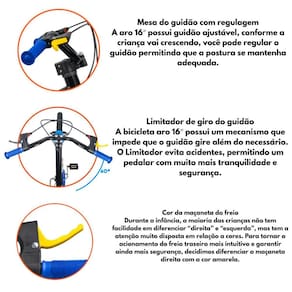 Bicicleta infantil nathor spider-man 2 aro 16 vermelho Diversão e aventura com conforto e segurança a bicicleta aro 16 nathor possui modelos com aro em abs e em alumínio. O limitador de giro evita que o guidão vire completamente, proporcionando mais segurança e preservando o freio. Para facilitar o aprendizado e a identificação do freio traseiro, a maçaneta amarela ganha destaque e indica o acionamento ideal na hora da frenagem. As rodinhas laterais permitem o desenvolvimento da criança na fase de aprendizado, estimulando o equilíbrio e a autonomia A aro 16 tem pneus com câmara, quadro em aço carbono e garrafinha. Atenção: devido à variação de modelos de monitores, as cores podem variar com a cor real do produto. Características técnicas: Modelo: spider-man 2 Cor predominante: vermelho Tamanho da roda: 16 Peso máximo recomendado: 30 kg Quadro, garfo e guidão em aço carbono Limitador de giro do guidão Freios v-brake com maçanetas em nylon reforçado e ajuste Mesa headset com regulagem de ângulo do guidão Rodinhas laterais Aro em alumínio ou aro em abs Para-lamas em abs Movimento de direção com Arruela com trava de segurança Pneus com câmara Abraçadeira do selim em alumínio Garrafinha Indicada para crianças a partir de 5 anos ou com altura entre 1,10 m e 1,20 m Registro inmetro - ce-bi/innac 00407-01a nm 301/2004 Diferenciais: Cor da maçaneta do freio: durante a infância, a maioria das crianças não tem facilidade em diferenciar direita e esquerda, mas tem a atenção muito disposta em relação à cores. Para tornar o acionamento do freio traseiro mais intuitivo e garantir ainda mais segurança, decidimos diferenciar a maçaneta direita com a cor amarela. Limitador de giro do guidão: a bicicleta aro 16 possui um mecanismo que impede que o guidão gire além do necessário. O limitador evita acidentes, permitindo um pedalar com muito mais tranquilidade e segurança. Mesa do guidão com regulagem: a aro 16 possui guidão ajustável, conforme a criança vai crescendo, você pode regular o guidão permitindo que a postura se mantenha adequada. Tamanho da roda: 16 Altura máxima recomendada: 110-120cm Peso máximo recomendado: Até 30kg Peso do produto: 9.5 Kg Peso com a embalagem: 10.74 Kg Cubagem: 0.11 m Dimensões da embalagem CxAxL : 48 x 23 x 97 CM