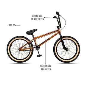 Já no quesito características técnicas as expectativas são superadas mais uma vez, contém uma cor linda no Cobre! Os pneus são largos, resistentes contedo uma faixa bege. O Quadro e guidão reto e pegs são construídos em Aço Hi-Ten, um aço excepcionalmente durável, leve e altamente resistente a oxidação e impactos típicos da prática esportiva do BMX. Para completar, os freios são U-Brake, Aro 20, super reforçado para realizar manobras radicais, com segurança e confiança e, ainda, pedivela monobloco. Tudo para garantir uma experiência incrível e inesquecível.Sem dúvidas é a escolha ideal para proporcionar momentos de diversão marcados com amor e carinho! Aproveite e adicione ao seu carrinho agora mesmo.