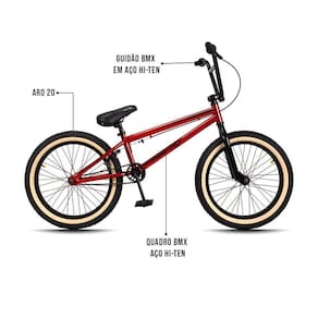 Já no quesito características técnicas as expectativas são superadas mais uma vez, pois conta com pneus de faixa bege largos e resistentes, guidão reto e pegs de aço. O Quadro e guidão são construídos em Aço Hi-Ten, um aço excepcionalmente durável, leve e altamente resistente a oxidação e impactos típicos da prática esportiva do BMX. Para completar, os freios são U-Brake, Aro 20, super reforçado para realizar manobras radicais, com segurança e confiança e, ainda, pedivela monobloco. Tudo para garantir uma experiência incrível e inesquecível.