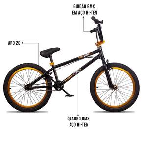 Bicicleta Aro 20 Bmx U-brake Rotor K7 Cog 9 Freedom P03 Preto E Dourado - D'rossi Impossível esquecer a sensação de quando ganhou sua primeira bicicleta, não é mesmo? Os inúmeros tombos e tentativas de manter-se equilibrado(a) criavam um misto de emoções que foram únicos e inesquecíveis não é mesmo?! Agora, chegou a sua vez de ensinar o pequeno(a) aí do seu lado com o melhor modelo do mundo das bikes bmx. Estamos falando da Bicicleta BMX Freedom, da DRossi, que é ideal para crianças com idade entre 7 a 11 anos.A Bicicleta Freedom conta com um designer sofisticado e inovador que as crianças amam! Afinal, os pneus largos e resistentes, bem como o guidão reto e pegs de aço garantem maior estabilidade. Já o quadro e guidão são construídos em aço Hi-Ten e CR-MO, um aço excepcionalmente durável, leve e altamente resistente a oxidação e impactos típicos da prática esportiva do BMX. Para completar, o aro 20 é super reforçado e permite a realização das manobras radicais, com segurança e confiança. Sem dúvidas é a escolha ideal para proporcionar um passeio confortável e mais suave para o dia a dia. Afinal, toda brincadeira compartilhada é um ato de amor e carinho! Então, que tal deixar memórias incríveis no seu pequeno(a)? Adicione agora mesmo ao seu carrinho!Especificações do Produto:Material do Quadro: Quadro BMX Aço HI-TENModelo e Composição do Guidão: Guidão BMX em Aço HI-TENModelo e Composição do Garfo: Garfo em Aço HI-TENMovimento Central: 50mmMovimento Direção: Over AheadSetModelo e Composição dos Freios: Freio U-Brake com RotorTipo de Engrenagem: Catraca K7 Cog 9 e Coroa 25 DentesMarca e Composição do Pedivela: Pedivela Monobloco 25T em AçoModelo de Pedal: Pedal NylonPneus: Aro 20 Modelo e Composição do Aro: Aro 20 Alumíno 36 FurosMarca e Composição dos Cubos: Cubos em Alumínio 36 Furos k7 Cog 9TMaterial do Canote: AçoMarca e Composição do Selim: Selim P.U. BMXImportante:Montagem do Equipamento: Bicicleta Pré Montada, necessita de montagem profissional, para ajustes de freio e outros componentes.Garantia do Fabricante: 3 MesesRecomendações de Uso: Iniciantes no esporteFotos ilustrativas/ a real do produto pode ser ligeiramente diferente devido a diferença de calibragem de telas.