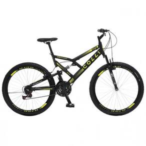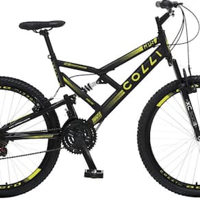 Bicicleta Colli Dupla Suspensão, Aro 26, Aro Comum Preto, 36 Raias, Trocador Na Luva, 21 Marchas, Freio V-Brake Dianteiro e Traseiro, Suporte De Guidão Down Hill Preto Expandido.