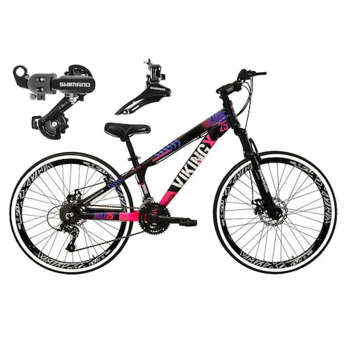 Bike aro 26, VIKINGX TUFF, nova na caixa a pronta entrega, produto com ótima qualidade e acabamento, possui 21 marchas com sistema de alavancas rapid fire que a cada clique uma marcha é trocada, sistema de freio a disco mecânico, pneus slick 1.5 com faixa branca. Bicicleta pré montada, vai precisar apenas fixar a roda dianteira, guidão, selim e pedais. Segue abaixo características da bike: Quadro 26 VikingX Tuff em Alumínio / Garfo aço preto 60mm suspensão / Suporte do guidão em alumínio preto / Guidão 31.8mm em alumínio preto / Canote do selim 27.2 em alumínio preto Sem carrinho / Selim Pro-X Freeride ou Yamada Mtb (dependerá da disponibilidade no estoque) / Abraçadeira do Selim alumínio Preto / Aros Vmaxx Super reforçados / Raios Finos / Cubos Pretos / Pneus 26x1.5 Slick com faixa branca / Movimento central selado rolamentado / Freios a disco Mecânicos com discos inox 160mm / Alavancas Semi-automáticas Rapid Fire / Câmbio Traseiro Shimano TZ / Câmbio Dianteiro Shimano TZ / Corrente Index / Pedivela Aço Revestido / Pedal Plataforma Nylon preto / Roda Livre 7v index dourada