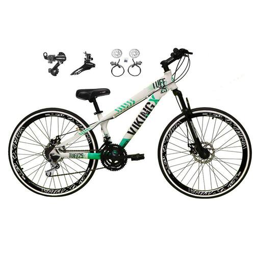 Bike aro 26, VIKINGX TUFF, nova na caixa a pronta entrega, produto com ótima qualidade e acabamento, possui 21 marchas com sistema de alavancas rapid fire que a cada clique uma marcha é trocada, sistema de freio a disco hidráulico(óleo), câmbio dianteiro e traseiro Shimano Tz, pneus slick 1.5 com faixa branca. Bicicleta pré montada, vai precisar apenas fixar a roda dianteira, guidão, selim e pedais. Segue abaixo características da bike: Quadro 26 VikingX Tuff em Alumínio / Garfo aço preto 60mm suspensão / Suporte do guidão em alumínio preto / Guidão 31.8mm em alumínio preto / Canote do selim 27.2 em alumínio preto Sem carrinho / Selim Pro-X Freeride ou Yamada Mtb (dependerá da disponibilidade no estoque) / Abraçadeira do Selim alumínio Preto / Aros Vmaxx Super reforçados / Raios Finos / Cubos Pretos / Pneus 26x1.5 Slick com faixa branca / Movimento central selado rolamentado / Freios a disco Hidráulicos com discos inox 160mm / Alavancas Semi-automáticas Rapid Fire / Câmbio Traseiro Shimano Tz / Câmbio Dianteiro Shimano Tz / Corrente Index / Pedivela Aço Revestido / Pedal Plataforma Nylon preto / Roda Livre 7v index dourada