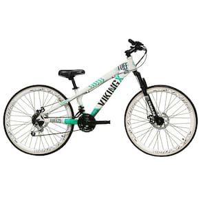 Bike aro 26, VIKINGX TUFF, nova na caixa a pronta entrega, produto com ótima qualidade e acabamento, possui 21 marchas com sistema de alavancas rapid fire que a cada clique uma marcha é trocada, sistema de freio a disco mecânico, pneus slick 1.5 . Bicicleta pré montada, vai precisar apenas fixar a roda dianteira, guidão, selim e pedais. Segue abaixo características da bike: Quadro 26 VikingX Tuff em Alumínio / Garfo suspensão AÇO 60MM / Suporte do guidão em alumínio preto / Guidão 31.8mm em alumínio preto / Canote do selim 27.2 em alumínio preto Sem carrinho / Selim Pro-X Freeride ou Yamada Mtb (dependerá da disponibilidade no estoque) / Abraçadeira do Selim alumínio Preto / Aros Vmaxx Super reforçados / Raios Finos / Cubos Pretos / Pneus 26x1.5 Slick / Movimento central selado rolamentado / Freios a disco Mecânicos com discos inox 160mm / Alavancas Semi-automáticas Rapid Fire / Câmbio Traseiro Importado / Câmbio Dianteiro Importado / Corrente Index / Pedivela Aço Revestido / Pedal Plataforma Nylon preto / Roda Livre 7v index dourada