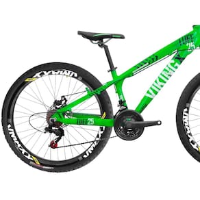Bicicleta Aro 26 VikingX Tuff25 21v Freio Mecânico e Trava COMPONENTES DA BIKE - Quadro: Alumínio Viking Tuff X 25 - Suspensão de 100mm com Trava no Ombro - Aros Vzan Vmaxx SL - Raios Zincados Pretos - Pneus Aro 26 Com Arame - Camara de ar 26 - Jogo Direção Ahead Set Rolamentado - Suporte Do guidão de Alumínio - Guidão em Alumínio - Canote do Selim em Alumínio - Pedal em Plataforma Comum - Arruela Calço para Ahead Set (3 unidades) - Manopla Mtb Comum Confort - Abraçadeira do Selim com Blocagem - Selim - Disco de Freio De 160mm Parafusos - Freio a Disco Mecânicos com Pastilha RELAÇÃO (TRANSMISSÃO DA BIKE) - Roda Livre 7v - Roda Tripla De Aço - Trocador Semi Automático Rapid Fire de 7V - Cambio Dianteiro Indexado 3V Importado - Cambio Traseiro Indexado 7V Importado - Cubos Sistema Roda Livre esferado - Corrente Indexada 7V - Jogo de Centro Blindado - Cubos Esferados