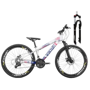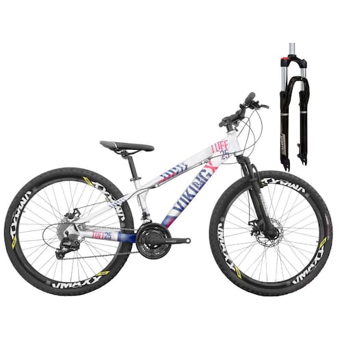 SUSPENSÃO COM TRAVA | FREIOS HIDRÁULICOS | QUADRO VIKING TUFF X 25 | AROS VZAN VMAXX | 24 MARCHAS COMPONENTES DA BIKE - Quadro: Alumínio Viking Tuff X 25 - Suspensão de 100mm com Trava no Ombro - Aros Vzan Vmaxx SL - Raios Zincados Pretos - Pneus Aro 26 Com Arame - Camara de ar 26 - Jogo Direção Ahead Set - Suporte Do guidão de Alumínio - Guidão em Alumínio - Canote do Selim em Alumínio - Pedal em Plataforma Comum - Arruela Calço para Ahead Set (3 unidades) - Manopla Mtb Comum Confort - Abraçadeira do Selim com Blocagem - Selim - Disco de Freio De 160mm Parafusos - Freio a Disco Hidráulico com Pastilha RELAÇÃO (TRANSMISSÃO DA BIKE) - Roda Livre Indexada de 8v - Roda Tripla De Aço Reforçado - Trocador Semi Automático Rapid Fire de 8V - Cambio Dianteiro Indexado 3V Importado - Cambio Traseiro Indexado 8V Importado - Cubos Sistema Rosca esferado - Corrente Indexada 8V - Jogo de Centro Blindado - Cubos Esferados