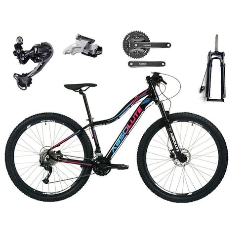 Bike Feminina aro 29, com quadro Absolute Hera, nova na caixa a pronta entrega, produto com ótima qualidade e acabamento, possui 27 marchas com sistema de alavancas rapid fire que a cada clique uma marcha é trocada, câmbio dianteiro shimano altus e traseiro shimano deore M592, garfo com suspensão e sistema de trava no guidão para melhor performance, sistema de freio a disco hidráulico, pneus com cravo baixo para uso em terra e asfalto. Bicicleta pré montada, vai precisar apenas fixar a roda dianteira, guidão, selim e pedais. Segue abaixo características da bike:Quadro Feminino 29 Absolute Hera em AlumínioGarfo 29 suspensão absolute com Trava no guidão e regulagemSuporte do guidão em alumínio pretoGuidão 31.8mm em alumínio pretoCanote do selim 27.2 em alumínio preto Com carrinhoSelim Sport PretoAbraçadeira do Selim alumínio PretoAros Aero Parede dupla reforçadoRaios PretosCubos em Alumínio Pretos com blocagensPneus 29 com cravoMovimento central selado rolamentadoFreios a disco Hidráulicos com discos inox 160mmAlavancas Semi-automáticas Rapid Fire gta/sunrunCâmbio Traseiro shimano deore M592 27VCâmbio Dianteiro shimano altus 9vCorrente Index dto/pacoPedivela shimano Mt101 ou M371 27v(DEPENDERÁ da disponibilidade no estoque)Pedal Plataforma Nylon pretoCassete k7 gta Sunrun 11/32 cromada