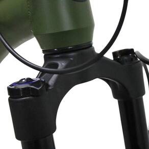 Seu quadro em alumínio com cabeamento interno proporciona leveza, durabilidade e um visual moderno e limpo. A suspensão dianteira com 100mm de curso e trava no ombro permite adaptação perfeita ao tipo de terreno, enquanto os freios a disco hidráulicos oferecem segurança e resposta imediata.