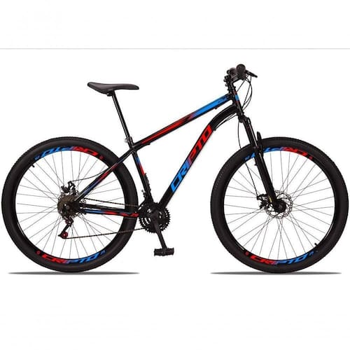 Suspensão: Dianteira | Modalidade: Mountain Bike | Aro: 29 | Marchas: 21 Cor: Preto/Azul e Vermelho