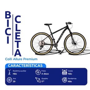 Caracteristicas: Marca: Colli Modelo: Allure Premium Aro: 29 Marchas: Sim Quantidades de marchas: 12 marchas Tamanho do quadro: 17 Freio: Freio a disco hidraulico Pedivela: 34 dentes com 175 mm Cambio traseiro: 12VL importado Cambio dianteiro: Alavanca de cambio 12VL importado Garfo: Aluminio Material do cubo: Aluminio Guidao: Aluminio Banco: Sem molas Suspensao: Sim Corrente: Fina 126 EL Pneus: 28 x 2.10 Cesta: Nao Paralamas: Nao Suporte para garrafa: Nao