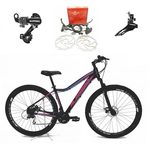 Bike aro 29 Alfameq Pandora Feminina em alumínio , nova na caixa a pronta entrega, produto com ótima qualidade e acabamento, possui 24 marchas com câmbio dianteiro e traseiro Shimano e sistema de alavancas rapid fire que a cada clique uma marcha é trocada, garfo com suspensão, sistema de freio a disco hidráulico(óleo). Quadro com tubo rebaixado para facilitar subir e descer da bike. Bicicleta pré montada, vai precisar apenas fixar a roda dianteira, guidão, selim e pedais.Segue abaixo características da bike: