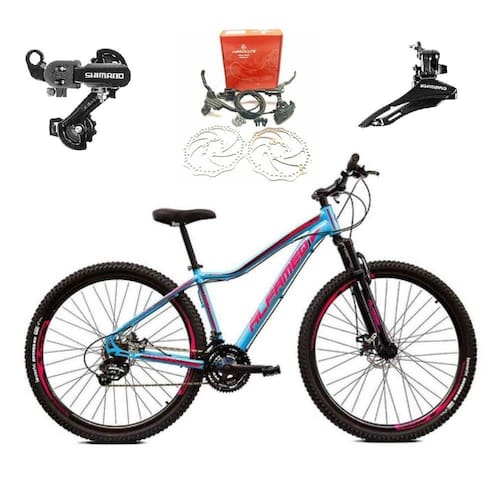 Bike aro 29 Alfameq Pandora Feminina em alumínio , nova na caixa a pronta entrega, produto com ótima qualidade e acabamento, possui 24 marchas com câmbio dianteiro e traseiro Shimano e sistema de alavancas rapid fire que a cada clique uma marcha é trocada, garfo com suspensão, sistema de freio a disco hidráulico(óleo). Quadro com tubo rebaixado para facilitar subir e descer da bike. Bicicleta pré montada, vai precisar apenas fixar a roda dianteira, guidão, selim e pedais.Segue abaixo características da bike: