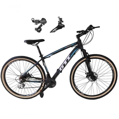 Bike aro 29, com quadro Gti Roma, nova na caixa a pronta , produto com ótima qualidade e acabamento, possui Freios a disco, Câmbio dianteiro e traseiro Shimano, 21 marchas com sistema de alavancas rapid fire que a cada clique uma marcha é trocada, garfo com suspensão. Bicicleta pré montada, vai precisar apenas fixar a roda dianteira, guidão, selim e pedais.