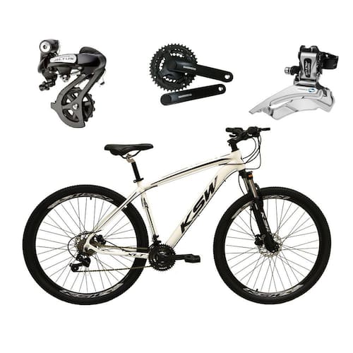 Quadro 29 KSW Xlt em Alumínio Garfo 29 suspensão com Trava no Ombro Suporte do guidão em alumínio preto Guidão 31.8mm em alumínio preto Canote do selim 27.2 em alumínio preto Com carrinho Selim Sport Preto Abraçadeira do Selim alumínio Preto Aros Aero Parede dupla reforçado Raios Pretos Cubos em Alumínio Pretos com blocagens Pneus 29 com cravo Movimento central selado rolamentado Freios a disco Hidráulicos com discos inox 160mm Alavancas Semi-automáticas Rapid Fire GTA/SUNRUN Câmbio Traseiro SHIMANO ALTUS 24V M310(ou equivalente) Câmbio Dianteiro SHIMANO ALTUS M313 (ou equivalente) Corrente Index DTO/PACO/FSC Pedivela SHIMANO Tourney 24v Pedal Plataforma Nylon preto Cassete k7 GTA 11/32 cromado (encaixe)