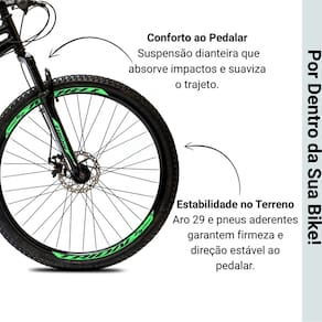 Aro 29 com pneus de alta aderência: Enfrenta trilhas e terrenos urbanos com mais estabilidade e rolagem suave.