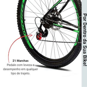 Sistema de 21 marchas: Ideal para encarar subidas e retas com eficiência e leveza no pedal.