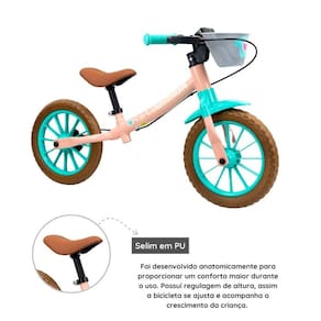 Selim em PU: foi desenvolvido anatomicamente para proporcionar um conforto maior durante o uso. Possuí regulagem de altura, assim a bicicleta se ajusta e acompanha o crescimento da criança.