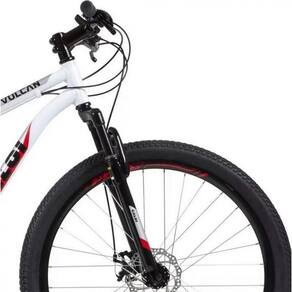 A Mountain Bike de entrada para trilhas leves, a Vulcan conta com quadro de alumínio, câmbio Sunrun, freio a disco mecânico,