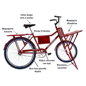 Quadro, Garfo, Bagageiro, Paralamas, Cobre Corrente, Guidão e Canote do Selim em Aço Carbono Engrenagem 46D em Aço Freio dianteiro e traseiro V-brake mais freio traseiro contra pedal. Maçaneta de Freio em Nylon Manopla Pedal Plástico Pedivela Monobloco Pneus e Câmaras de Ar 26" Aros em Alumínio parede dupla Raios 2.0mm Selim largo Bagageiro Dianteiro e Traseiro Idade Recomendada Adulto