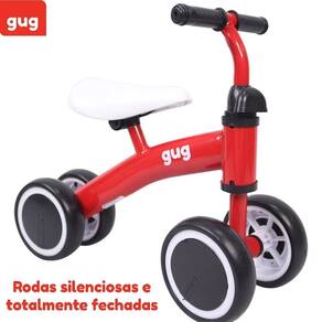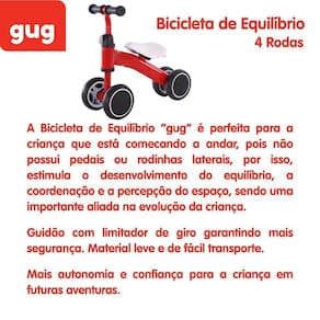 Conteúdo Caixa : 1 Bicicleta de Equilíbrio 4 rodas Vermelha Gug 20kg Embalagem: 50cm x 20cm x 18cm Marca: Não Informado