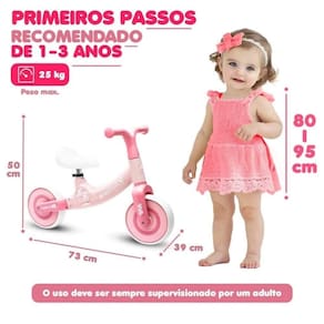 Ideal para introduzir as crianças no mundo do ciclismo de forma divertida, segura e educativa. Indicada para crianças a partir de 3 anos, ela foi desenvolvida especialmente para estimular o equilíbrio, a coordenação motora e a autoconfiança dos pequenos antes da transição para bicicletas com pedais. Seu design encantador em tons de rosa, com detalhes florais delicados, agrada tanto crianças quanto pais, combinando beleza e funcionalidade. A estrutura é leve, resistente e segura, facilitando o manuseio pela criança e garantindo maior durabilidade. O assento é confortável e possui ajuste de altura, adaptando-se ao crescimento da criança, enquanto as rodas largas, firmes e silenciosas proporcionam estabilidade e permitem o uso em ambientes internos e externos, como quintais, calçadas ou até dentro de casa.