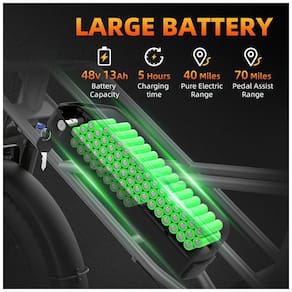 A bicicleta elétrica está equipada com uma bateria de lítio de alta capacidade de 48V 13Ah com energia total de 624Wh. A bateria adota tecnologia avançada antifurto, garantindo alta segurança. No modo de assistência de pedal, a autonomia supera 70 milhas, e no modo totalmente elétrico, atinge 40 milhas. Suporta carga rápida de 5-6 horas, é removível e possui classificação IP54 à prova d'água, tornando o carregamento conveniente independentemente do clima.