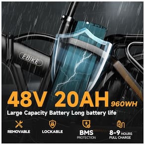 Condução segura e confortável: A bicicleta elétrica adota freio de desligamento automático EABS + freios a disco duplos dianteiros e traseiros para frenagem sensível. Ela foi projetada com forte desempenho off-road, força de frenagem confiável e alto fator de segurança. O garfo dianteiro e o canote de selim de alta resistência absorvem os solavancos de estradas longas e irregulares. Os pneus largos de 20" são antiderrapantes e à prova de furos, garantindo que você possa pedalar em estradas, neve, praias e estradas montanhosas acidentadas.