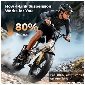 A bicicleta elétrica dobrável Jasion X-Hunter branca é indicada para uso adulto e combina quadro em alumínio com pneus largos 20x4, oferecendo estabilidade em vias urbanas, estradas de terra e trilhas leves. O sistema de suspensão dupla, com amortecimento dianteiro e traseiro, reduz impactos e vibrações, contribuindo para maior conforto em deslocamentos diários e percursos mais longos.