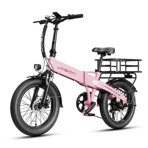 A bicicleta elétrica dobrável Jasion EB6 na cor rosa foi projetada para adultos que buscam mobilidade compacta, combinando quadro em alumínio leve com motor elétrico de 500W com pico de 1000W e bateria integrada de 48V. Ela atinge cerca de 37km/h de velocidade máxima, conforme o modo de assistência, peso do ciclista e relevo, oferecendo boa resposta para deslocamentos urbanos e trilhas leves. A construção dobrável facilita transporte e armazenagem em porta-malas, apartamentos e escritórios, mantendo robustez para uso diário.