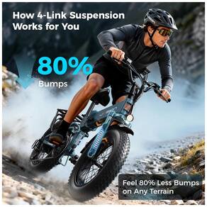 O conjunto de suspensão utiliza garfo dianteiro com curso de 80 mm e amortecedor traseiro em estrutura de quatro links, contribuindo para absorção eficiente de impactos em vias irregulares, trilhas leves, areia e neve. Os pneus largos 20 x 4 com construção resistente a furos ampliam a tração em superfícies variadas, enquanto os freios a disco mecânicos dianteiro e traseiro auxiliam nas frenagens em diferentes condições de uso.